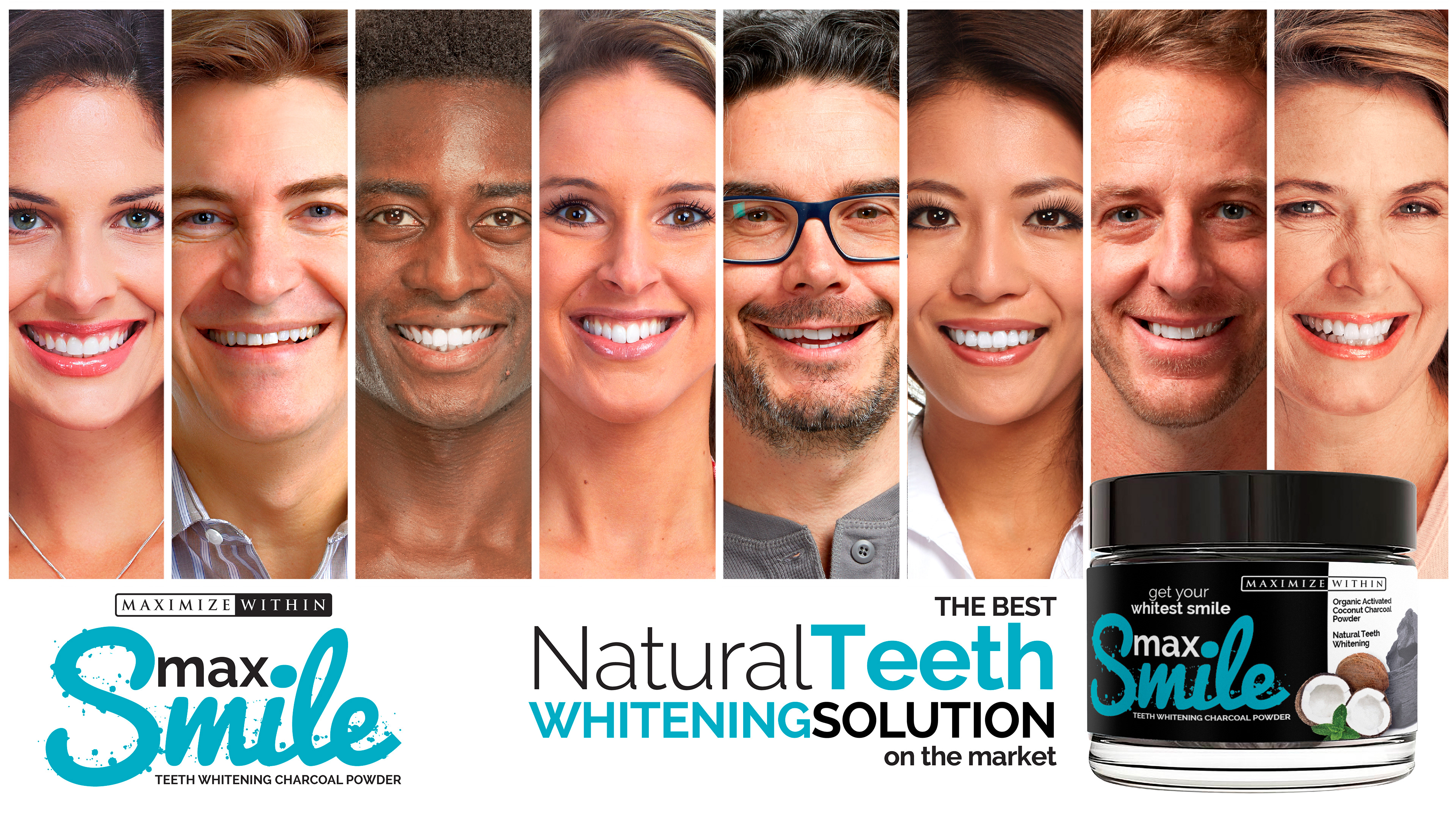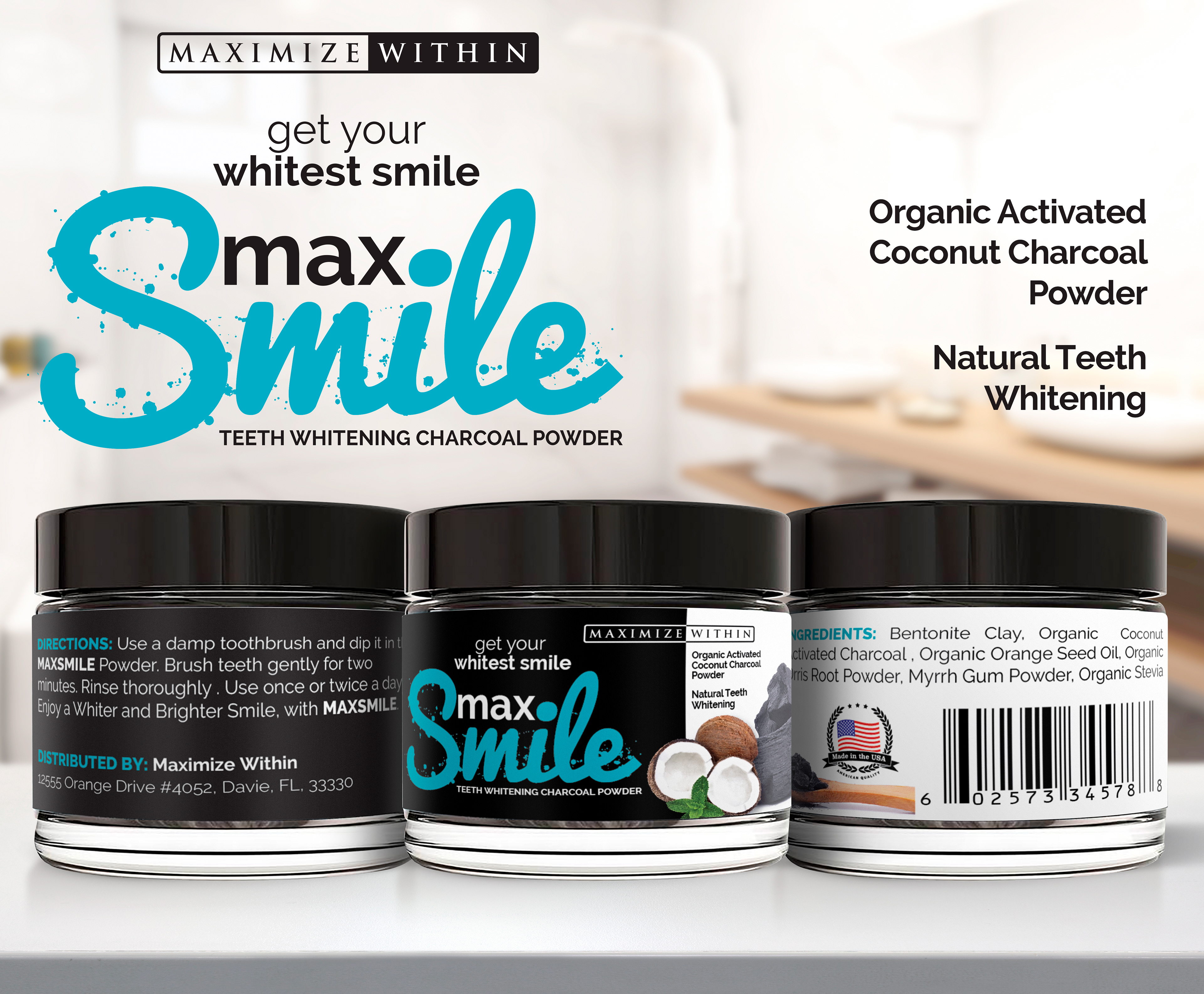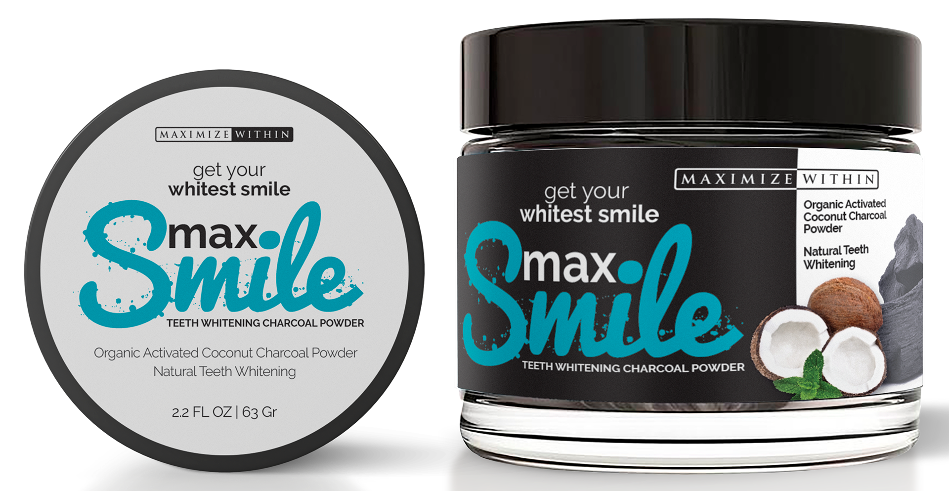 Max Smile Teeth Whitening Charcoal Powder is a product made by Maximized Within from Amazon.com. This project include product labels on both cap and on bottle, label mock-up and the product presentation for online selling.
